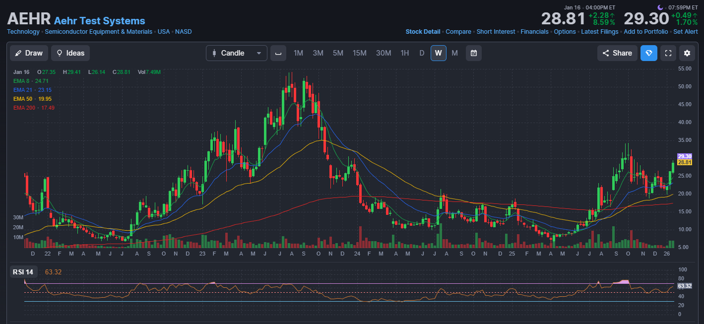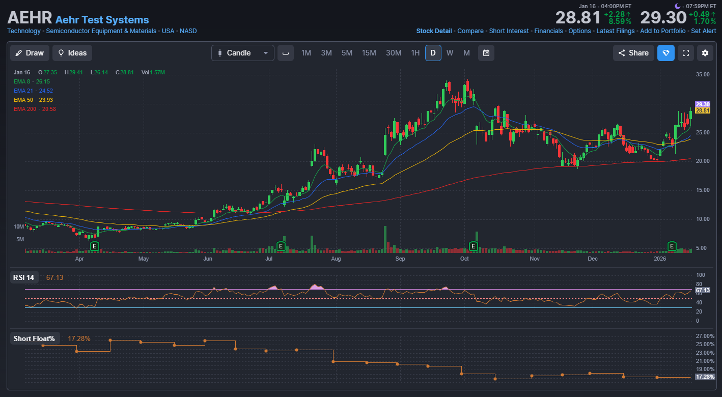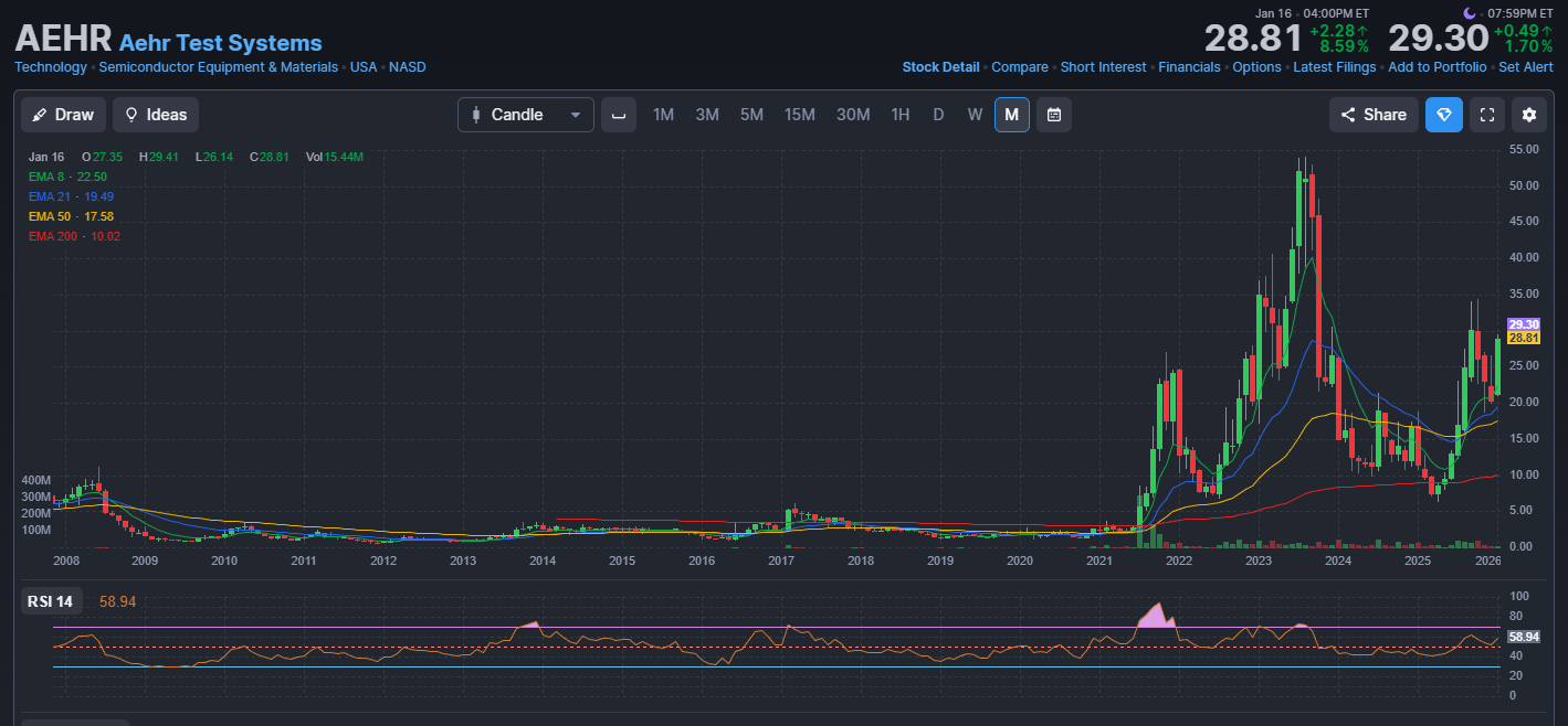 ATR is 2.07, and 7.2% of the stock price, which makes AEHR meaningfully more volatile on a percentage basis than recent picks. With the 50 EMA ~17% below Friday’s close, a true breakdown would be costly, so position size matters here.