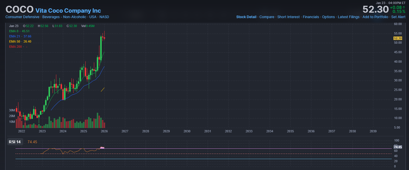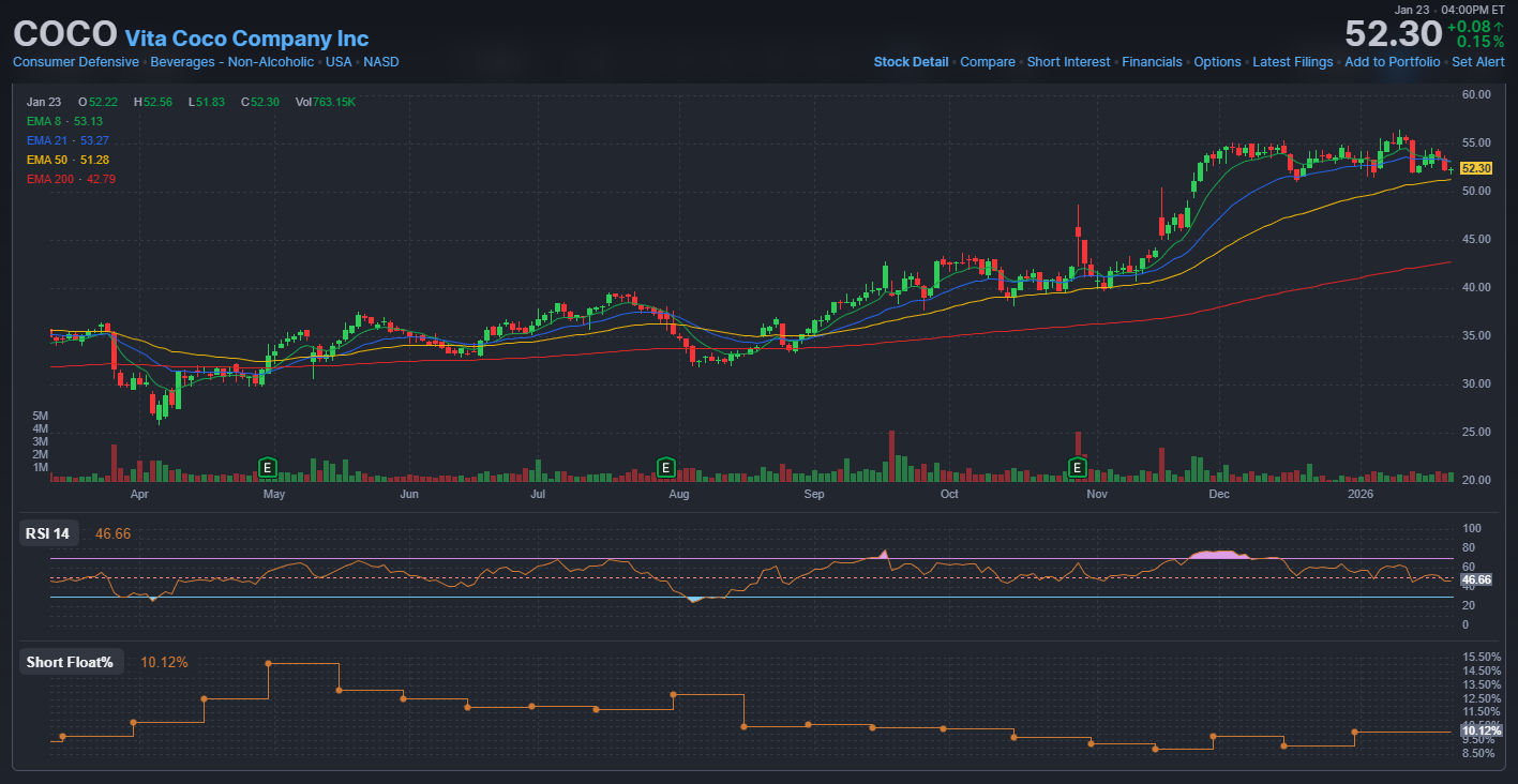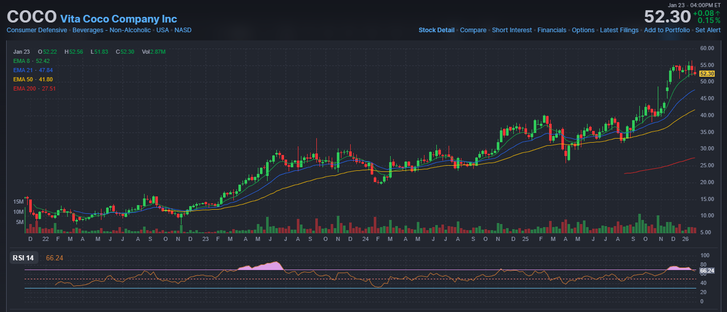 Vita Coco Company Inc is a branded beverage company focused on coconut water and adjacent hydration products, distributed broadly across U.S. retail and international channels.