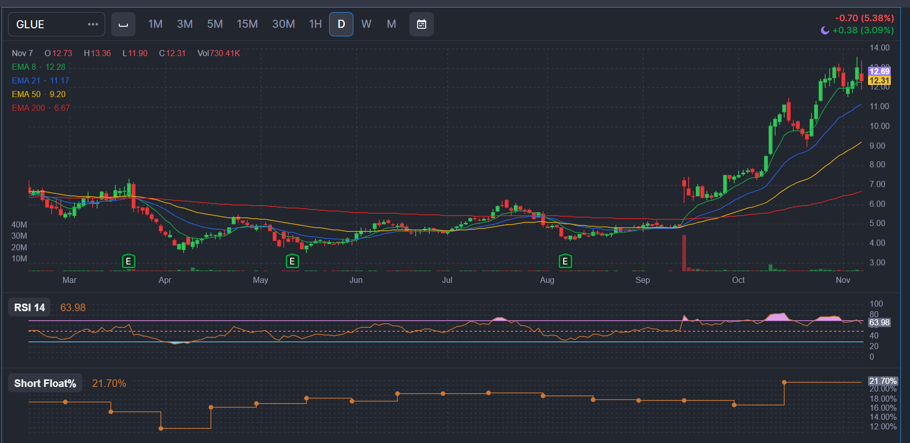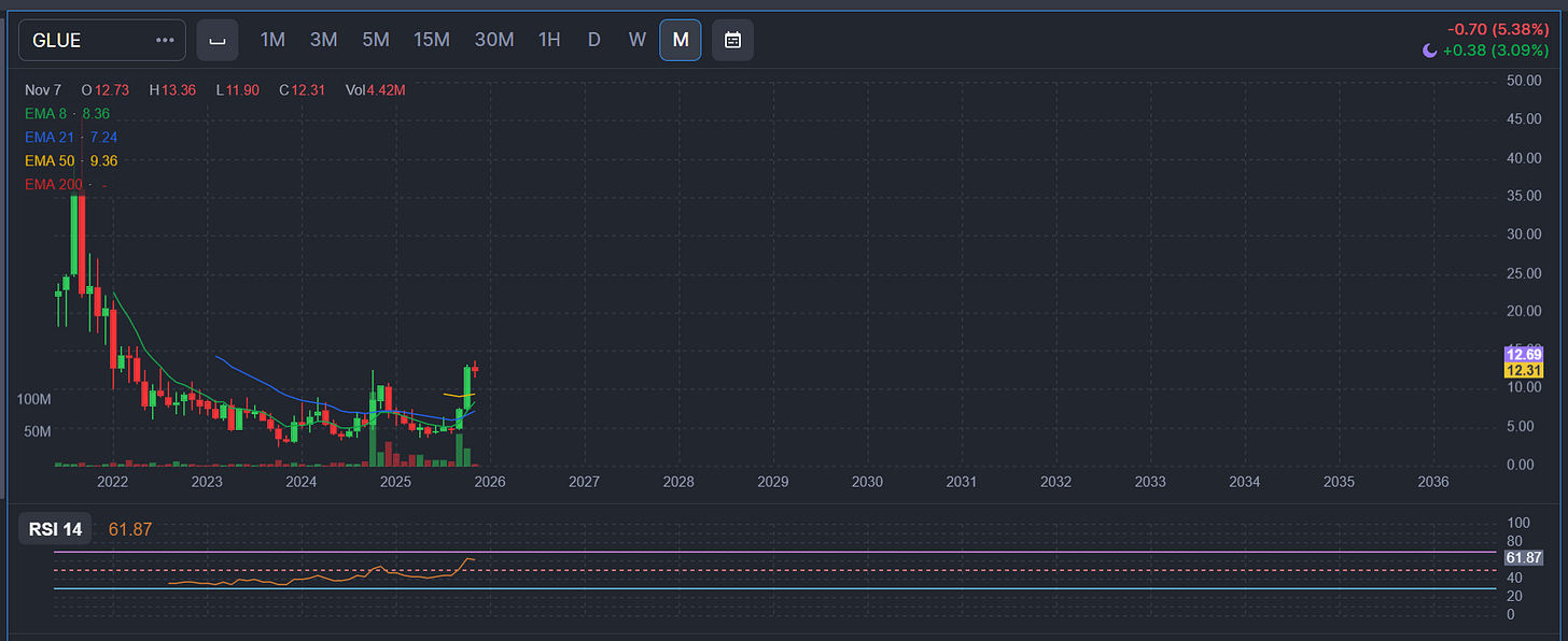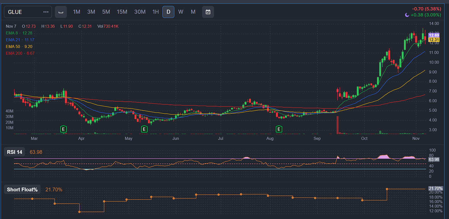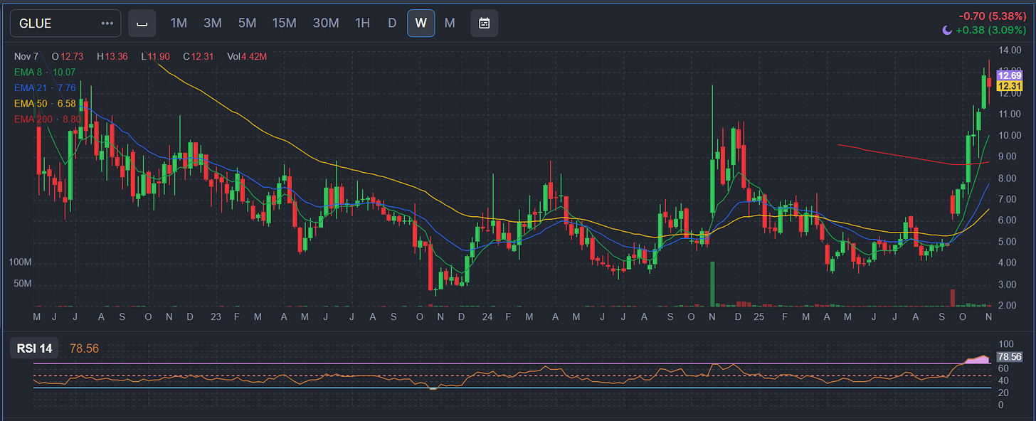 GLUE scores at the top of small caps in my model this week. It’s a strong asymmetric setup with explosive float dynamics, strong partnerships, it’s in a post-earnings bull flag, and it’s my weekly pick.
