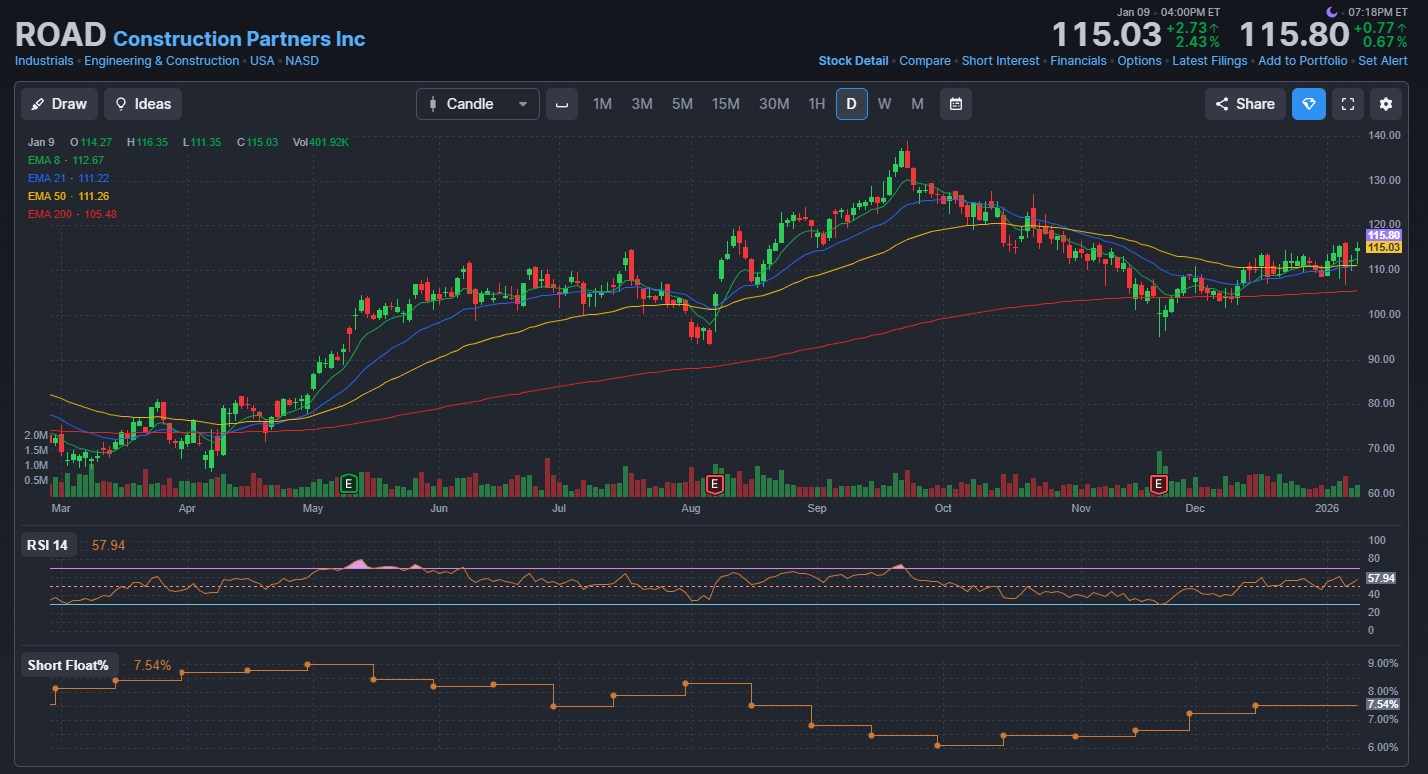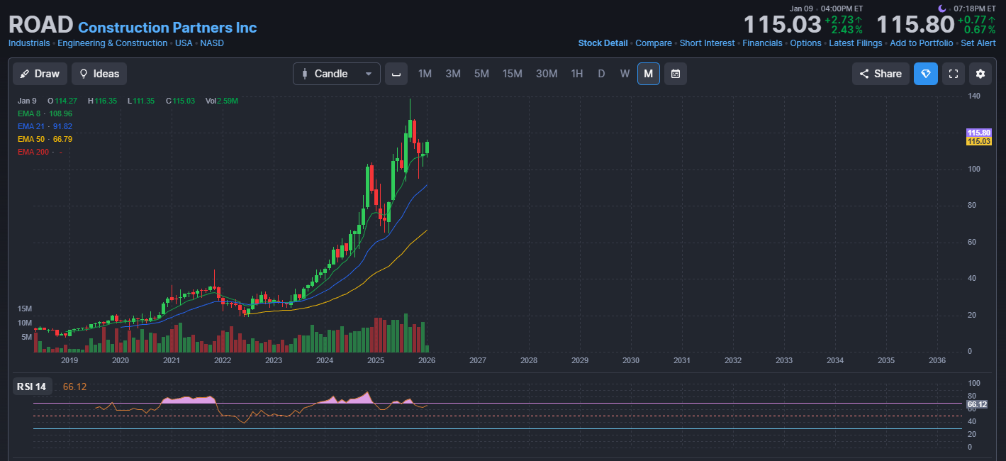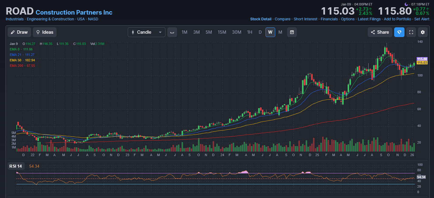 Compared to most industrial names right now, ROAD is earlier in the next potential leg, not later in the current one. And historically every pullback has been a buying opportunity. I like that brand of predictability.