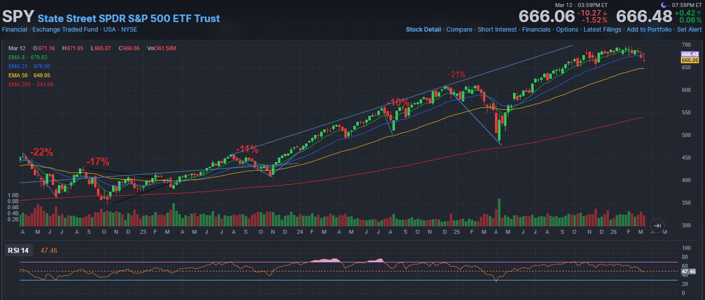 I posted this chart mid-week but worth adding here. The S&P is still very heavily extended above the 200EMA on the Weekly. Oil price spikes are compounding the downside risk and the chart shows the depth of recent pullbacks. It could get ugly quickly so keep your stops tight and fight the urge to over-trade. There will be some really good risk/reward setups when the dust finally settles but you’ll need cash to take advantage. I keep an active watch list of dozens of tickers and price alerts for pullbacks to major EMA support on longer time frames. I also keep a watch list of stocks that display relative strength in a weak tape - those are the names that usually become the next market leaders.