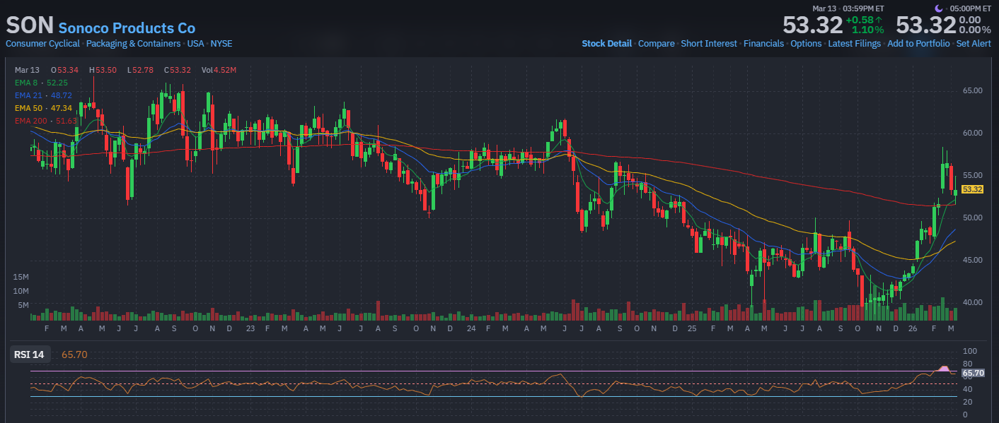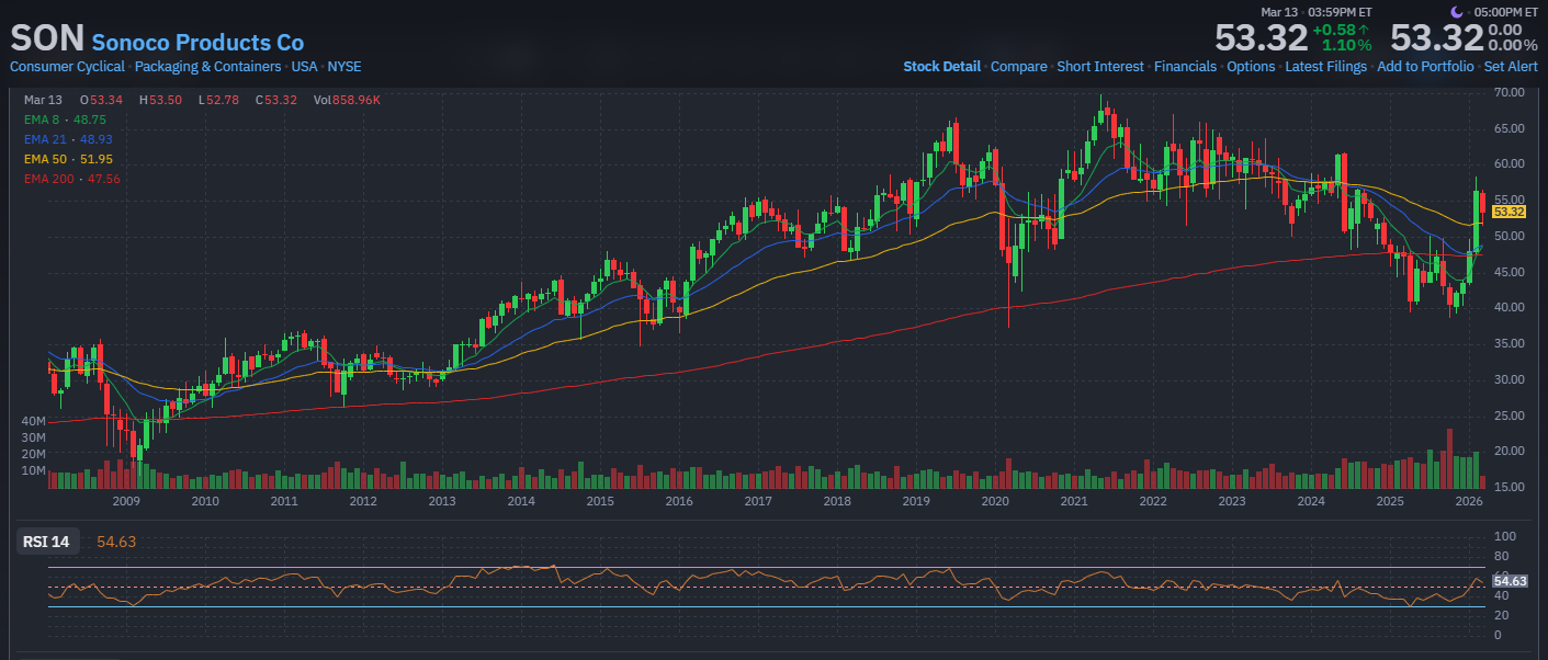 I’m trading SON primarily with shares and I may layer in some calls but option liquidity is lower and spreads are wider than I prefer.